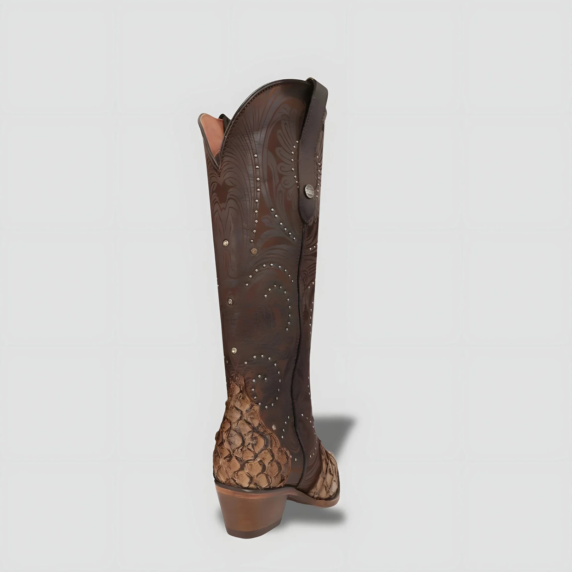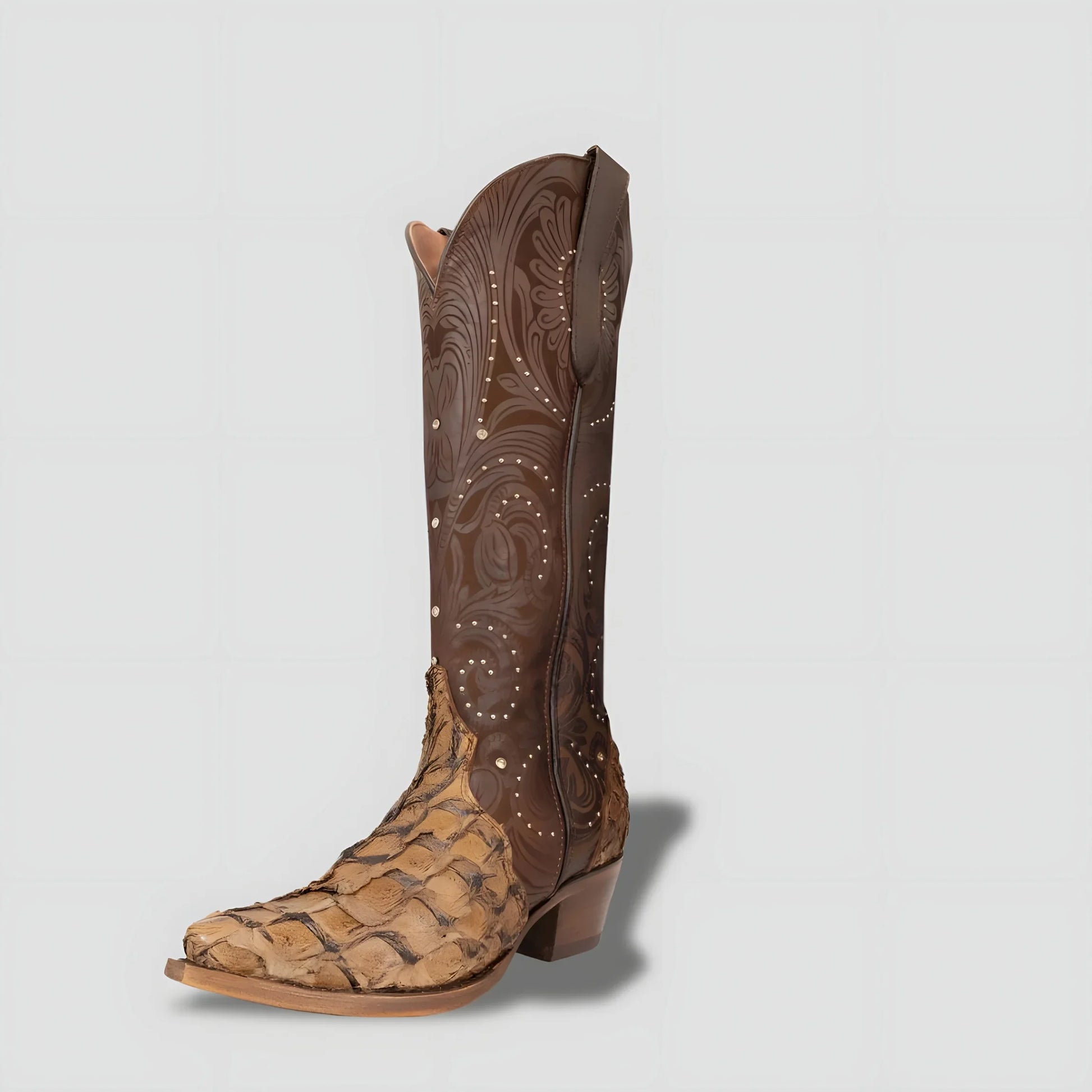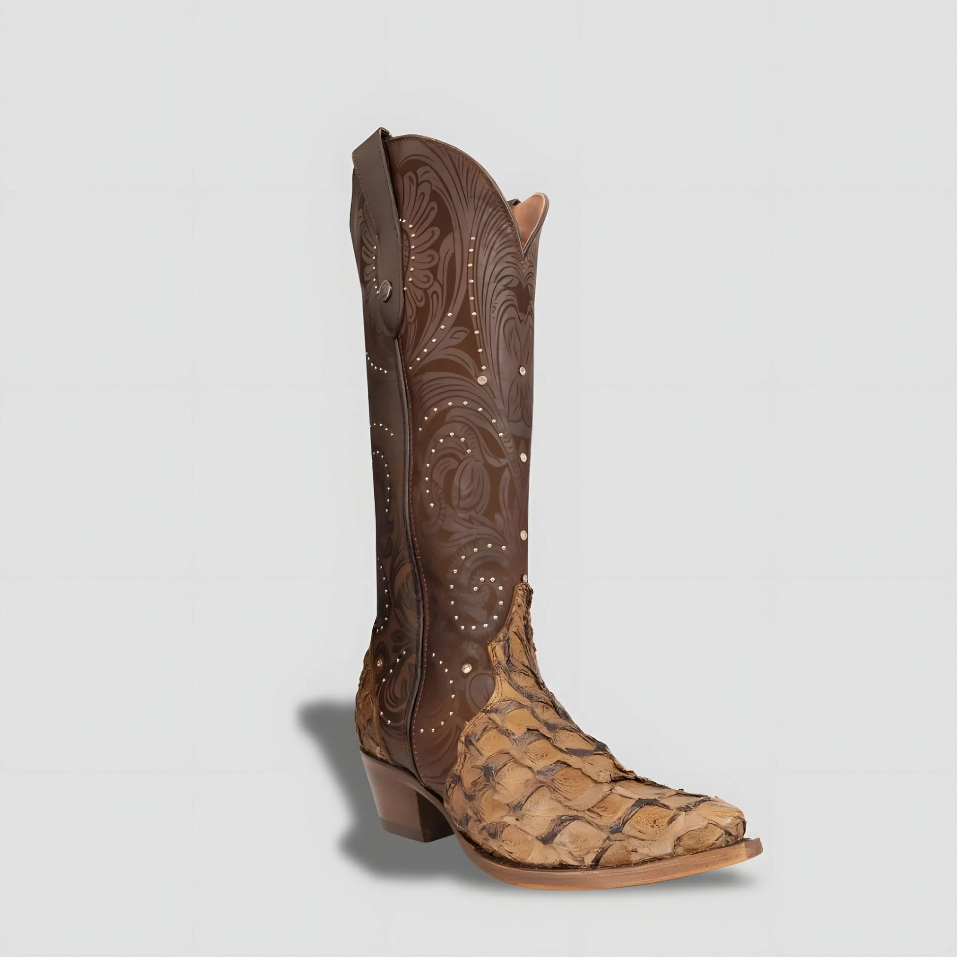 Camel-toned boot crafted from exotic pirarucu leather, with detailed, high-precision laser engraving that provides an unmistakable seal of distinction. Its deep, natural, and unique texture reflects the grandeur of traditional craftsmanship taken to the highest level.